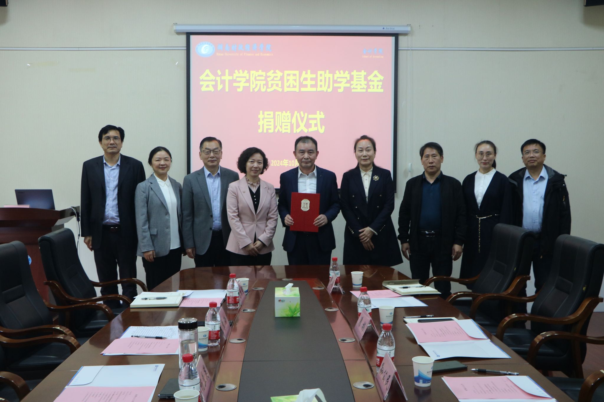 (本网讯)10月28日下午,会计学院贫困生助学基金捐赠仪式于办公楼215会议室进行。学校党委书记杨兰英、学校党委副书记苏玲、财务处处长曹松林、就业创业中心(校友联络中心)主任刘振强、亚太鹏盛税务师事务所股份有限公司合伙人孙公民、会计学院领导班子成员及三办主任和部分师生代表出席了本次捐赠仪式。会议由会计学院党委书记戴恩湘主持。