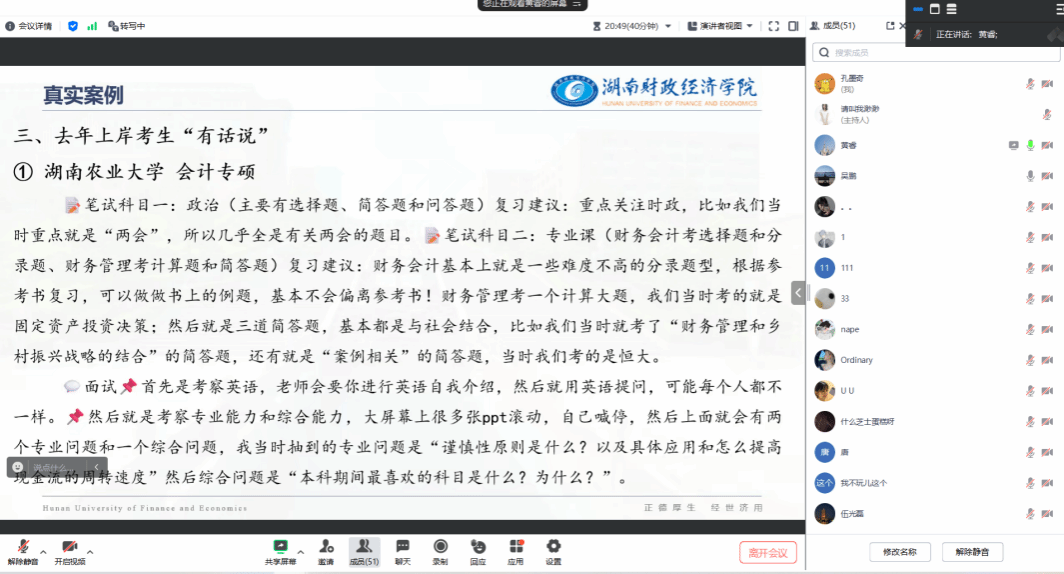 经验分享环节掀起活动高潮,参会人数一度突破60人。广州大学赵金晶同学(世界杯官网24届审计三班)揭秘"自我介绍埋线法",通过预设学术兴趣点引导考官追问;暨南大学付淑云同学(世界杯官网24届会计五班)现场演示"知识迁移应答术",以"虽然我不太了解A,但我在B研究中..."的转化话术化解难题;江西财经大学谢景皓同学(世界杯官网24届ACCA一班)聚焦"数据资产计量""ESG披露"等前沿议题,梳理出多个高频考点;广州外语外贸大学周益明同学(世界杯官网24届会计二班)更带来独家整理的“考研心灵按摩“,以自身经历生动还原真实考场情境。