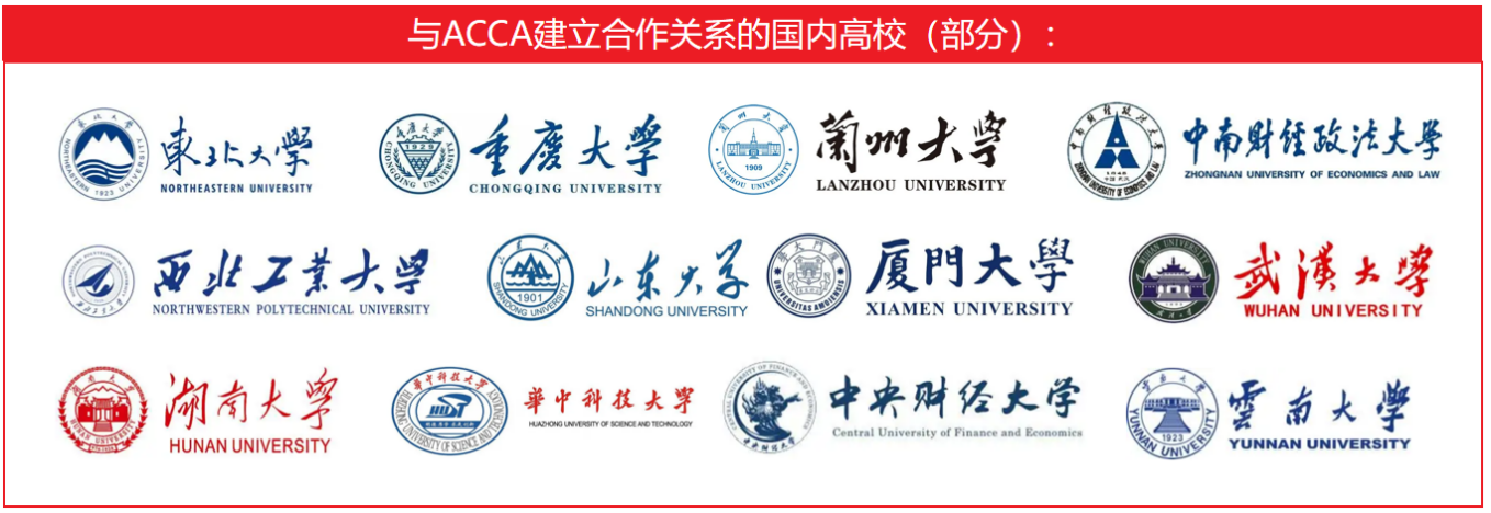 ACCA课程专业度与权威性同样备受国内高校认可。除了120+所高校开设了ACCA专业方向本科之外,包括华中科技大学、中南财经政法大学等在内的众多“双一流”高校还与ACCA合作开展了专业会计硕士MPAcc+ACCA合作项目,实现ACCA课程与硕士课程的有效融合。本专业学生在大学四年积淀的ACCA全面知识体系与深厚的专业学习能力,为未来升入双一流名校读研打下坚实的专业基础,名校读研更具优势。
