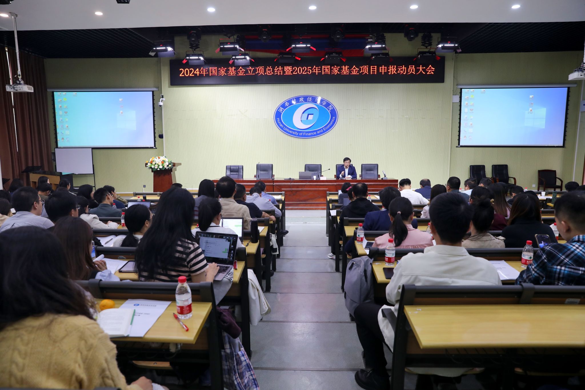 11月6日下午,世界杯官网2024年国家基金立项总结暨2025年国家基金申报动员大会在2J03教室召开。校长刘长庚、湘潭大学马克思主义学院吴家庆教授出席会议。各院负责人与科研副院长、科研处全体工作人员及拟申报2025年国家基金项目的博士、教授共200余人参加。会议由科研处处长李勇辉主持。