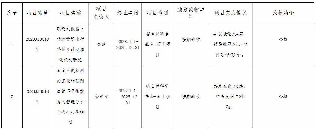 根据省科技厅工作会议精神、按照《湖南省自然科学基金项目管理办法》《关于省自然科学基金项目验收工作有关情况的通知》要求,科研处组织对杨鹏、余思洋两位老师的省自科基金项目进行结题验收,经材料审查、专家评审等程序,现将结果予以公示,公示期为2025年8月15日至2025年8月21日下午17点。
