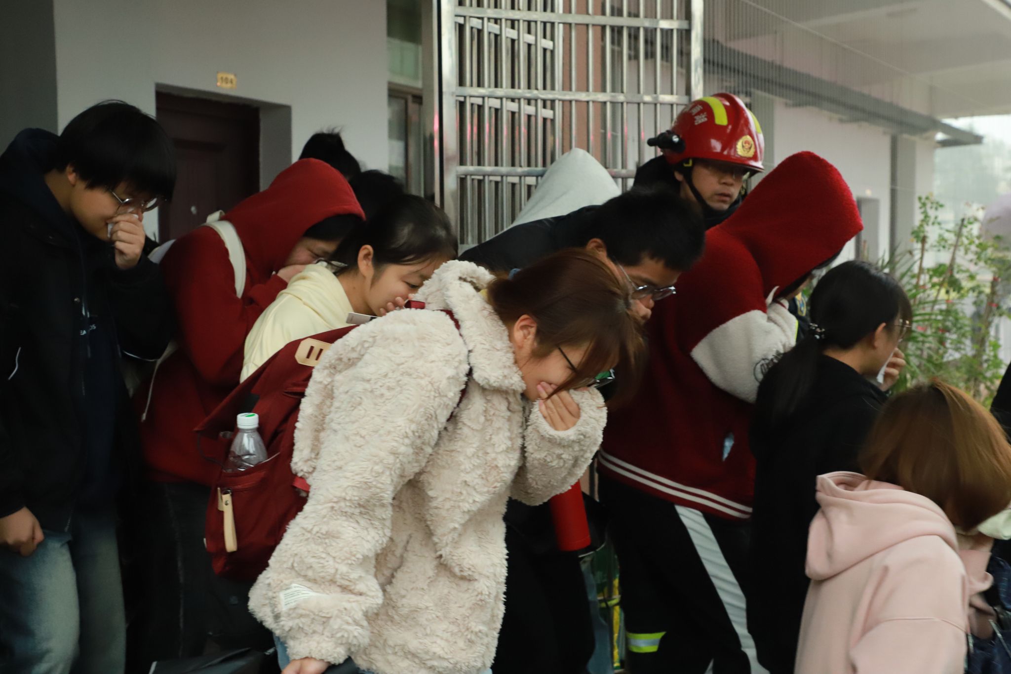 整个活动氛围平稳有序,校学生110护卫队的成员负责释放烟雾弹,模拟真实火灾现场。同学们迅速反应,按照事先学习的逃生知识,有条不紊地向安全区域集结,他们低头捂鼻,迅速穿过烟雾,展现出良好的自救本领和应急素养。