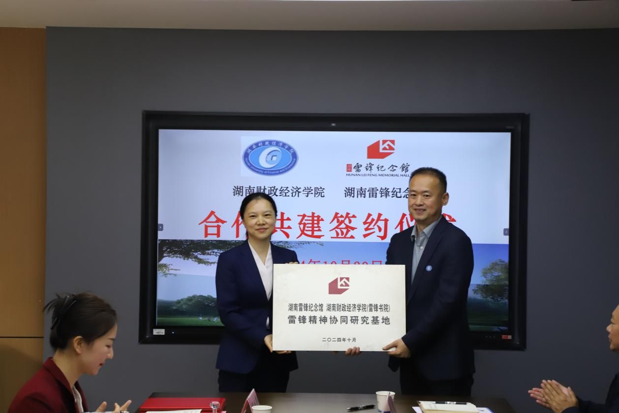 签约仪式上,苏玲与邹文代表双方签署合作共建协议。雷锋书院常务副院长杨健代表学校向湖南雷锋纪念馆颁授了“共学共建实践教育基地”牌匾,邹文向学校颁授了“雷锋精神协同研究基地”牌匾。