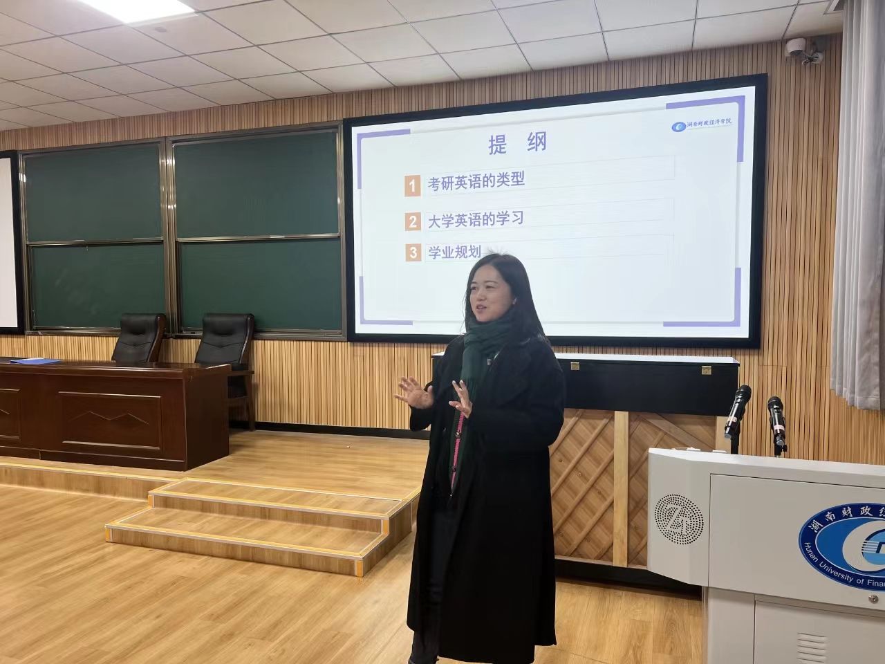 李曦,博士后,副教授,主持国家课题1项,博士后基金1项,省部级课题8项,发表科研教改论文22篇。获湖南省课堂教学比赛三等奖,校级教学比赛一等奖。座谈会上,李院长首先介绍了考研英语的类型,考研英语包含英语一和英语二两种,所有学术型硕士研究生和部分专业型硕士考英语一,一般专硕考英语二。接着谈到如何开展大学英语的学习,最后回到如何做好自己的学业规划。她建议同学们要在平时的学习中注重积累,她还给同学们提供了一个学习方法——在日历上写上每天要完成的学习计划。