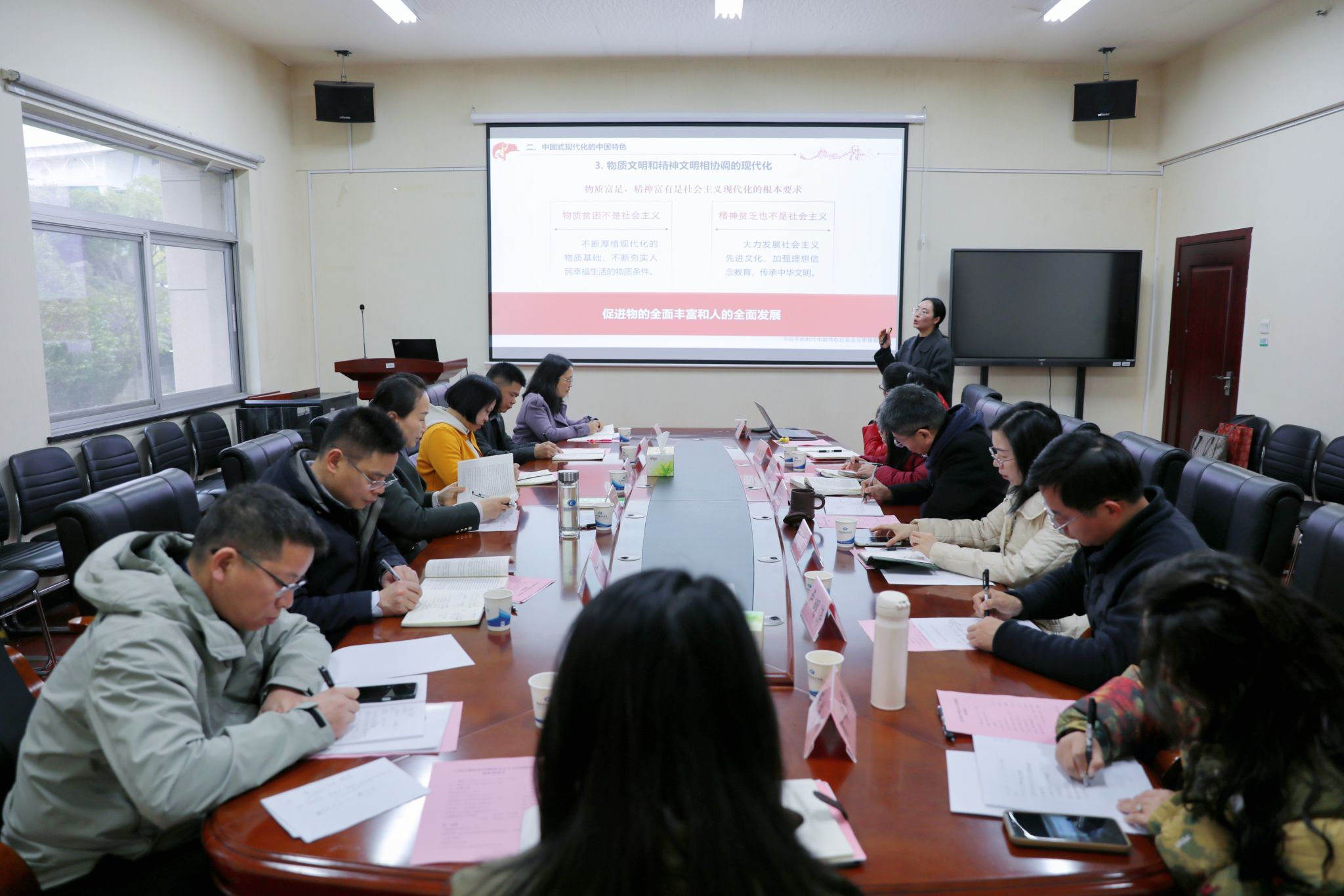 学院青年教师陶春霞围绕“中国式现代化是强国建设、民族复兴的唯一正确道路”进行教学展示。她从“中国式现代化是中国共产党领导人民长期探索和实践的重大成果”“中国式现代化的中国特色”“中国式现代化的本质要求”“中国式现代化创造了人类文明新形态”四个方面进行讲述,教学内容丰富,案例生动鲜活,展示效果良好。