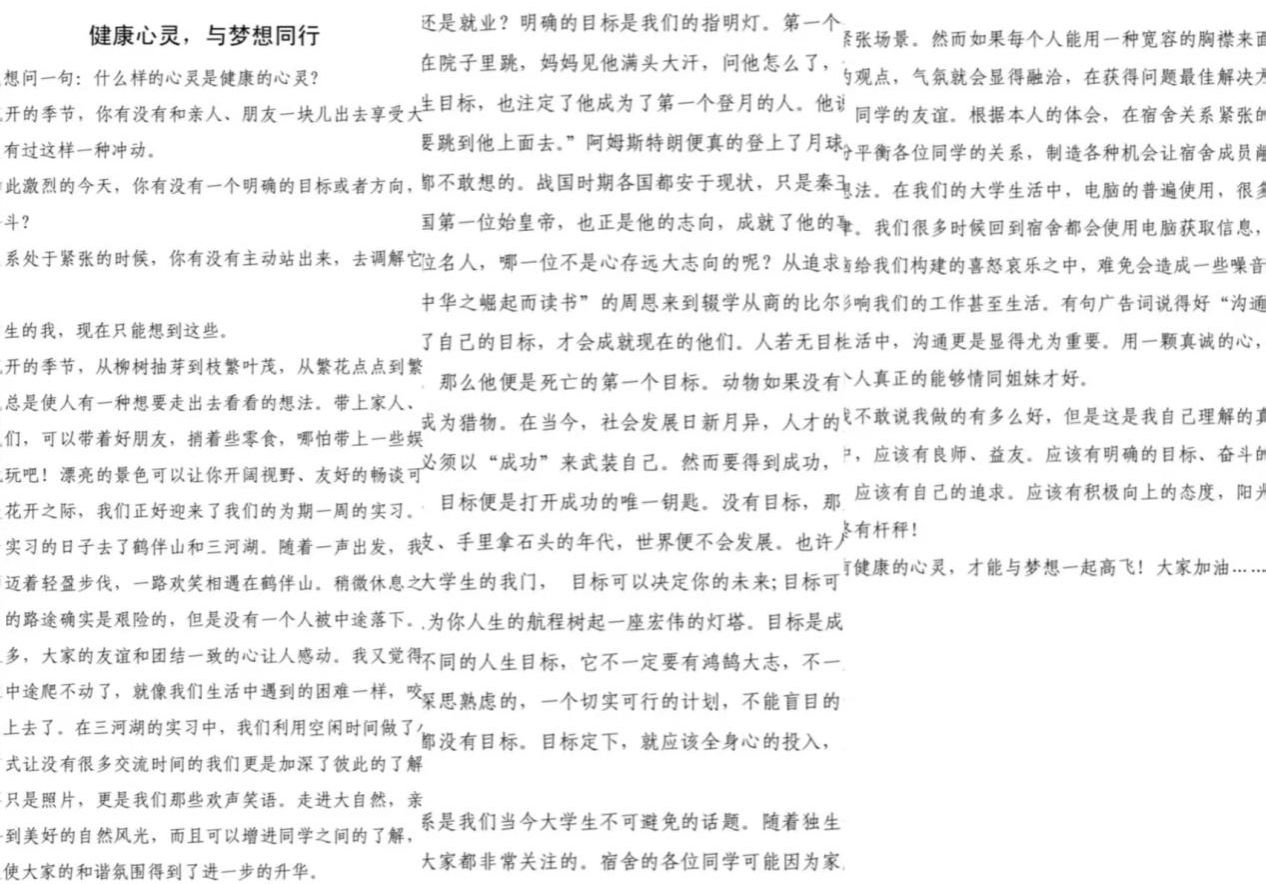 笔尖疗愈,书写心灵成长轨迹。聚焦“好好说话”理念,学院“与心灵对话”主题征文活动收到投稿30余篇,同学们以文字记录成长中的高光与低谷。2024级学生曹盼在《健康心灵,与梦想同行》中写道:“原来接纳不完美,才是真正爱自己的开始。”优秀作品通过学院公众号连载,并制成“心灵成长手账本”供学生传阅,不仅为参与者提供了一个安全自由的情感宣泄口,更通过文字的共鸣,打破个体间的孤独壁垒,营造出温暖包容的和谐氛围,构建起相互理解与支持的精神共同体。