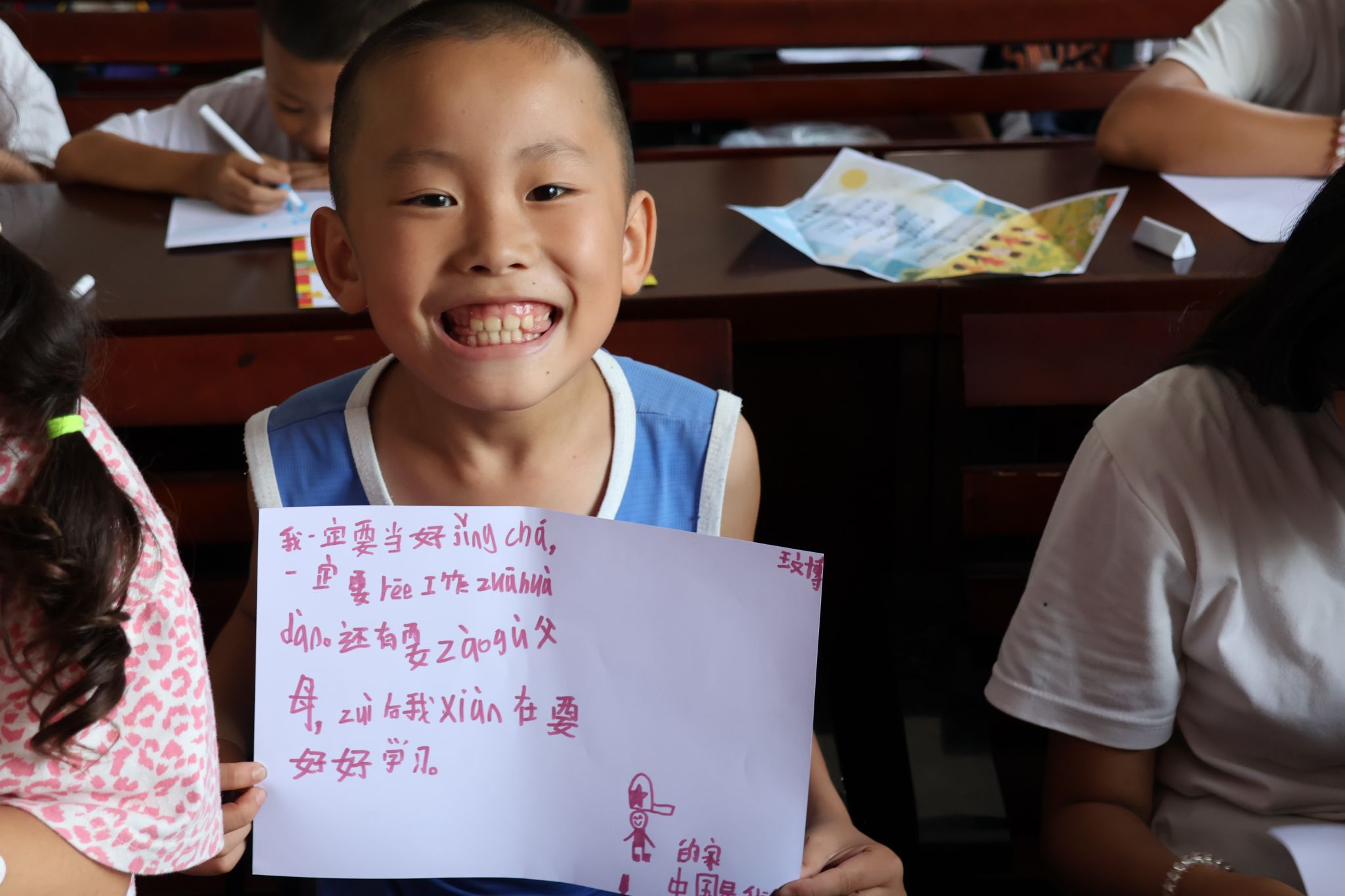 下午,实践团队将课堂教育与理想教育相结合,开展了理想信念教育活动。课堂以“我的理想”为切入点,引导孩子们畅想未来。孩子们踊跃举手,畅言心中所想:“我想当警察,保护大家”“我想当厨师,做可口的饭菜”“我想当老师,像你一样来上课”。探索理想信念的热情在一段段梦想的表达中被逐步激发。