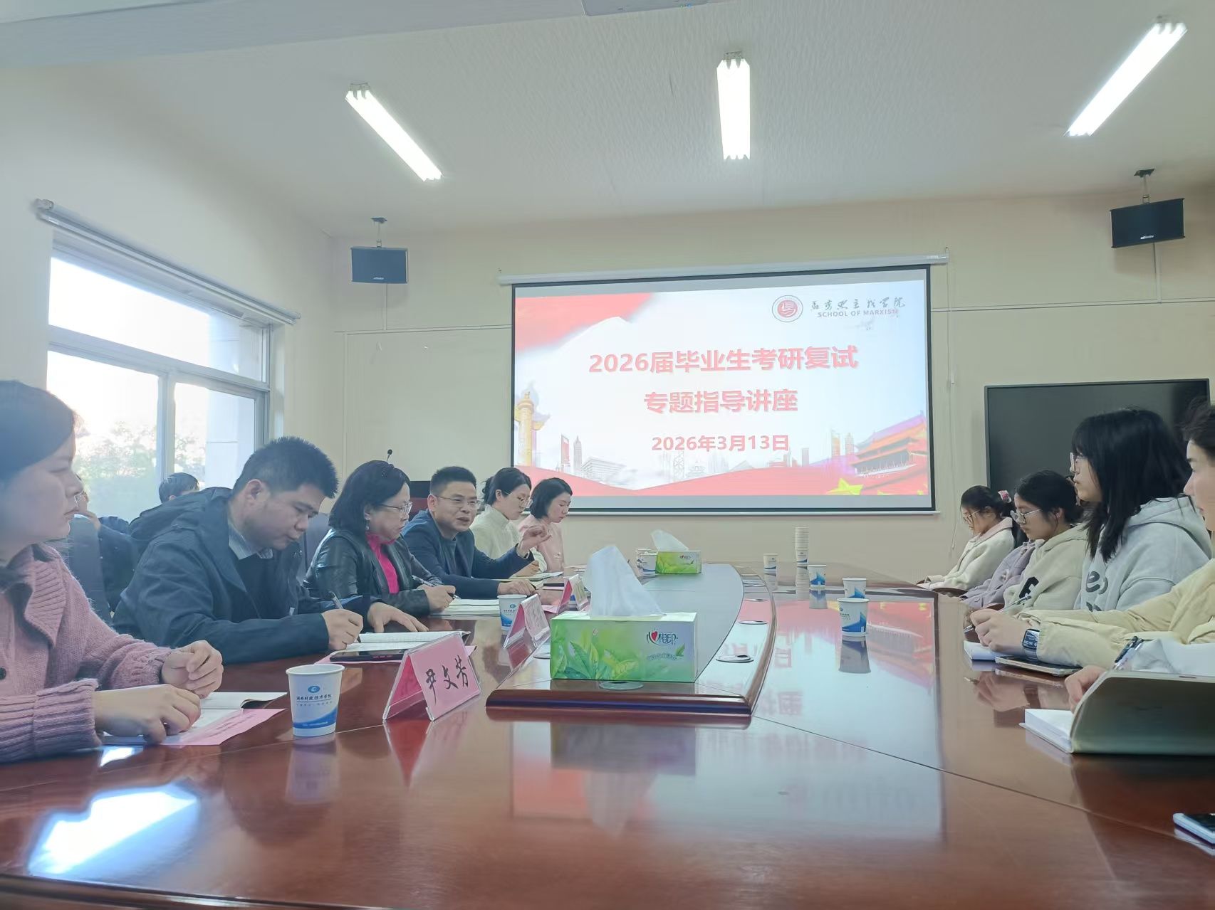 为精准助力考研学子提升复试备考质效、增强应试综合能力,3月13日下午,马克思主义学院在办公楼 217 会议室召开 2026 届毕业生考研复试专题指导会。学院党总支书记刘东艳、院长黄建跃、副书记游志能,以及全体辅导员、班主任出席会议,特邀吉晓雅、向昶霖、王义康三位嘉宾作专题指导,2026 届考研毕业生参会。会议由刘东艳书记主持。