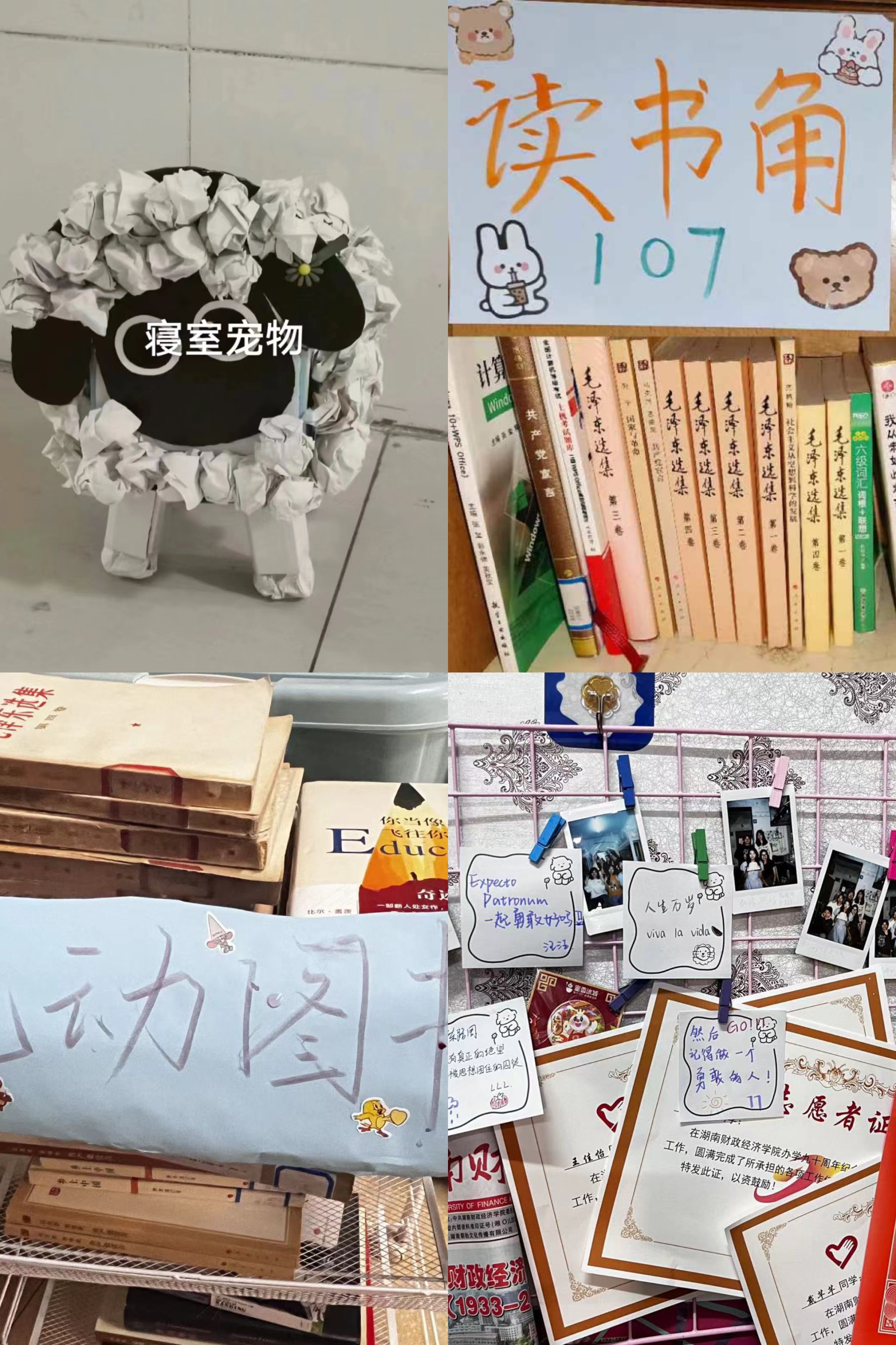 各寝室装扮风格多样,同学们纷纷将情感融入现实设计,贴上励志标语、打造特色读书角、对旧物进行创新性改造等,表达对美好大学生活的希冀,营造良好寝室文化氛围。