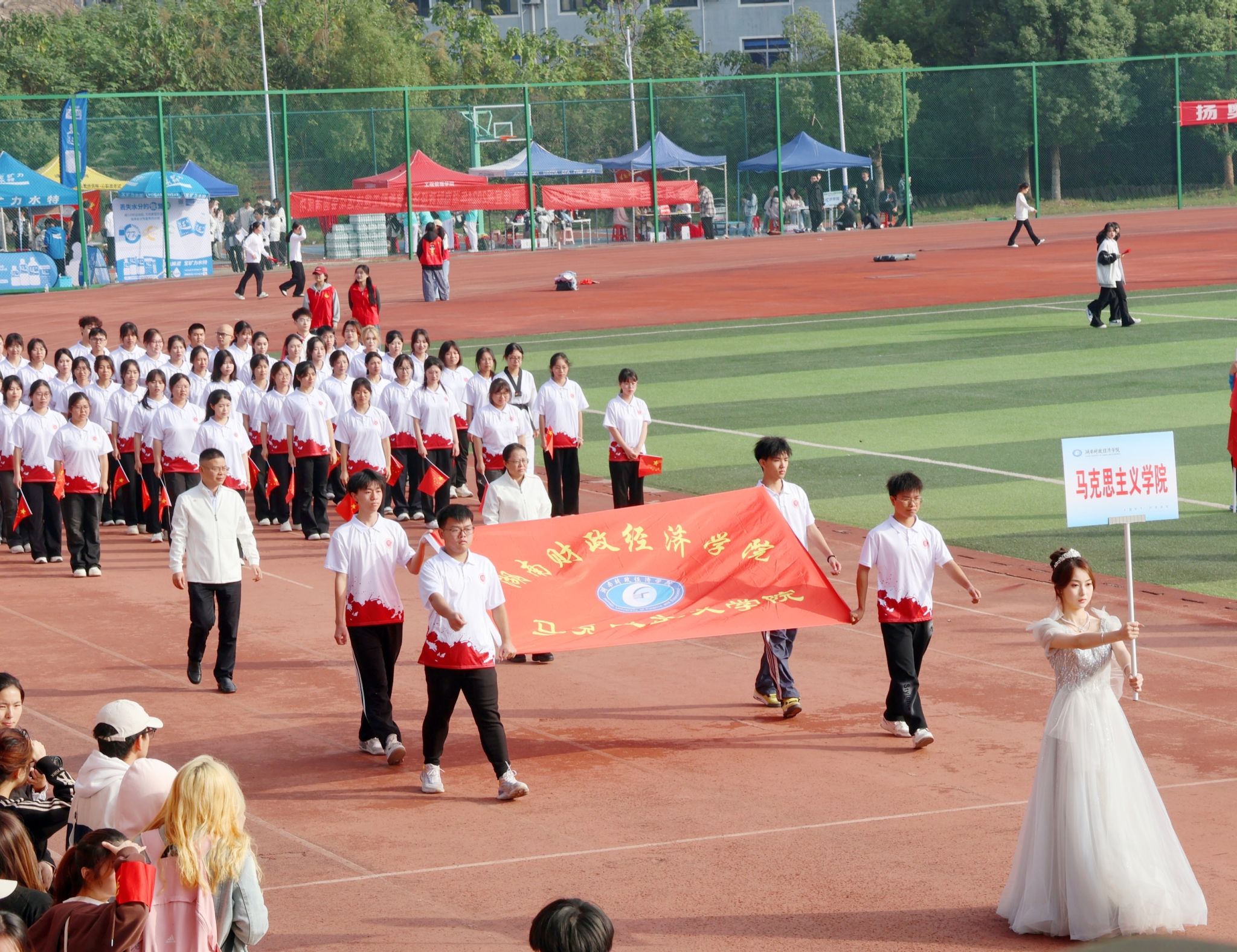 开幕式上,各个学院的方阵队踏着激昂的鼓点,迈着矫健的步伐有序入场,展现出湖财人的蓬勃朝气。马院学子身着院服,高喊着“马院姓马,在马言马”的口号坚定地迈向主席台。本次方阵由马克思主义学院的老师与同学们团结合作、共同完成。马院学子声情并茂的朗诵,用热血书写着“爱运动,强体魄”的口号;刚柔并济的武术表演,用汗水充分诠释着力量与艺术的完美融合;朝气蓬勃的舞蹈,用青春奏响活力四溢的动感乐章……一声声充满激情的口号、一个个充满热情的动作都充分展现着马院学子的飒爽英姿。