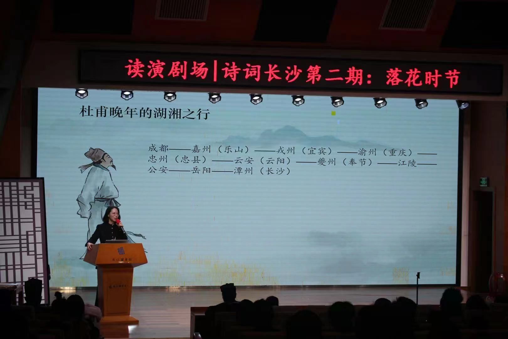 活动现场,人文与艺术学院艺术教育中心主任唐孕莲老师以杜甫的诗歌《江南逢李龟年》为引,向观众们讲述杜甫在湖南的生活和经历,以及杜甫爱国忧民思想对湖湘文化的影响,呈现唐朝的繁华与衰落。