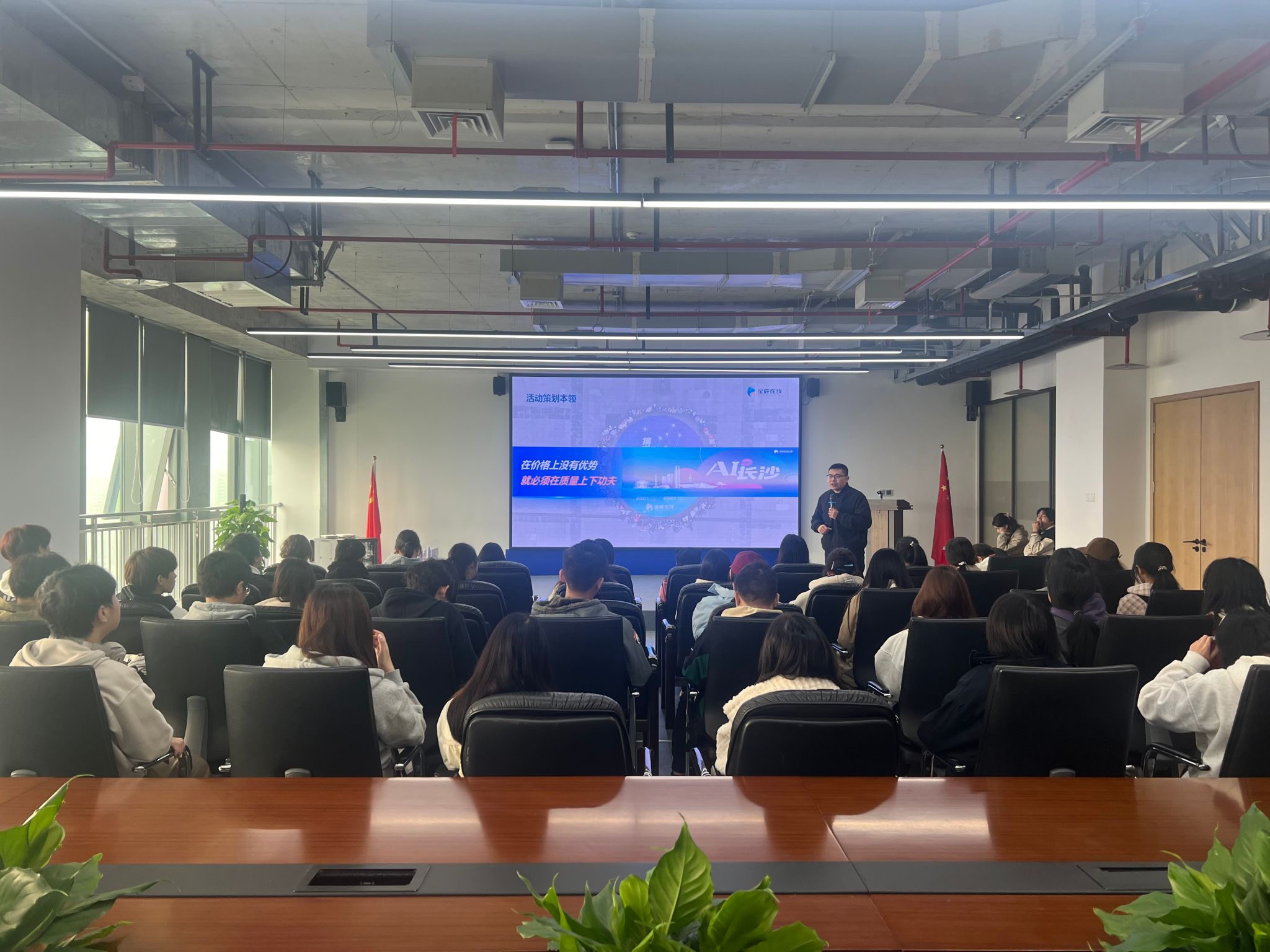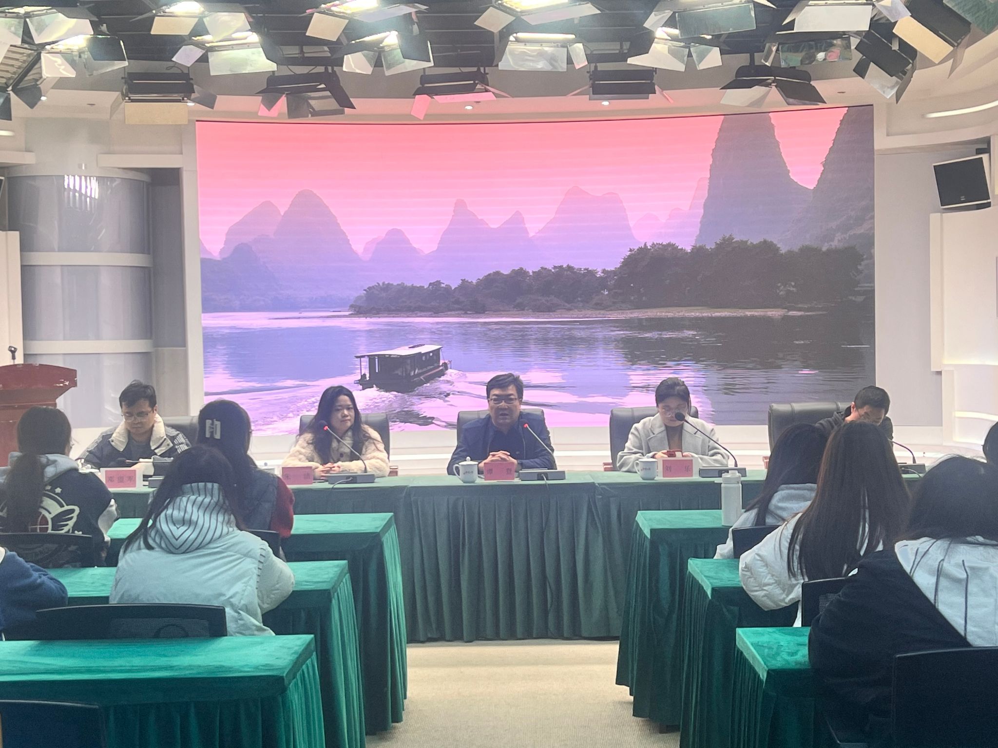 在湖南天合智造文化传媒有限公司,天合教育项目负责人唐飞、公司人力资源负责人易大莉热情接待了师生一行。易大莉介绍了公司的发展历程及“天合智造”“天合教育”“天合盛视”“天合元创”等业务版块,并结合《再见爱人》《现在就出发》等热点节目详细介绍了公司的后期制作等核心业务。在互动环节,易大莉对同学们关心的实习岗位、就业机会等问题作了细致解答。