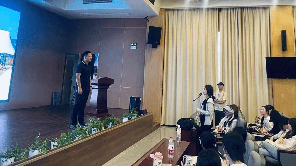 福临盟农文旅开发有限公司负责人王博从“湘遇福临”“文旅融合”“研学之旅”为同学们介绍了福临镇历史文化、农文旅统合发展现状及未来规划。他同时鼓励同学们运用专业知识建言献策,并提出“爱国主义教育研学课程、主题月旅游消费活动策划”两个方向。在现场的互动交流中,王总对同学提出的研学“环保小创意”表示肯定。