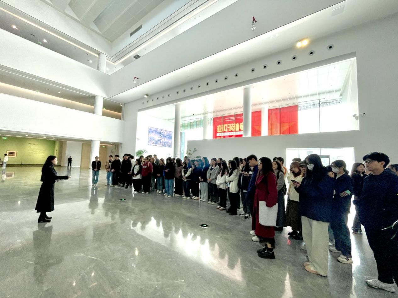 在湖南美术馆,师生参观湖南美术馆展陈,感受湖湘百年文化历史,欣赏历史优秀画作。湖南美术馆公教和宣传推广部何主任介绍了湖南美术馆展厅布局及近期相关活动,并与同学们进行了交流互动。