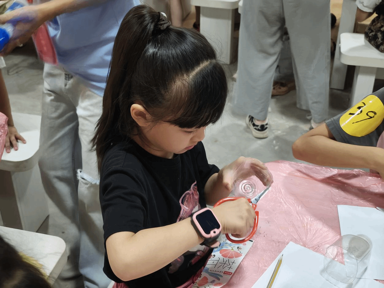 为了让小朋友们直观感受 “垃圾也能变宝贝”,在“如何利用垃圾”环节,老师现场展示了变废为宝的环保公益手工DIY过程。以一个废弃的矿泉水瓶为例,他们一步步演示:先拆掉包装纸,再用剪刀剪掉瓶口,接着沿着花纹剪出形状,最后用准备好的A4纸画上喜欢的图案并剪下来,沿着瓶子形状粘贴上去,一个可爱的小笔筒就制作完成了。这一过程生动地展现了垃圾回收利用的可能性,激发了小朋友们的创作热情和环保意识。