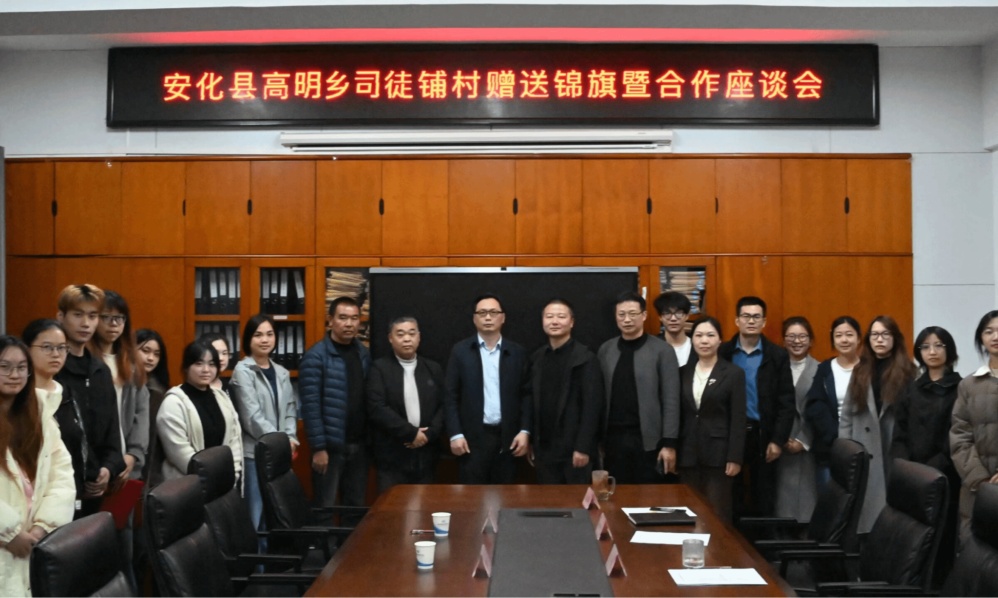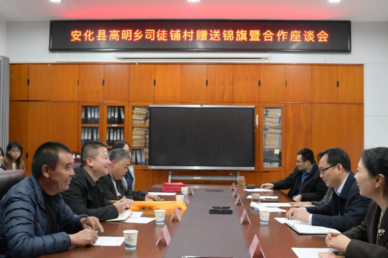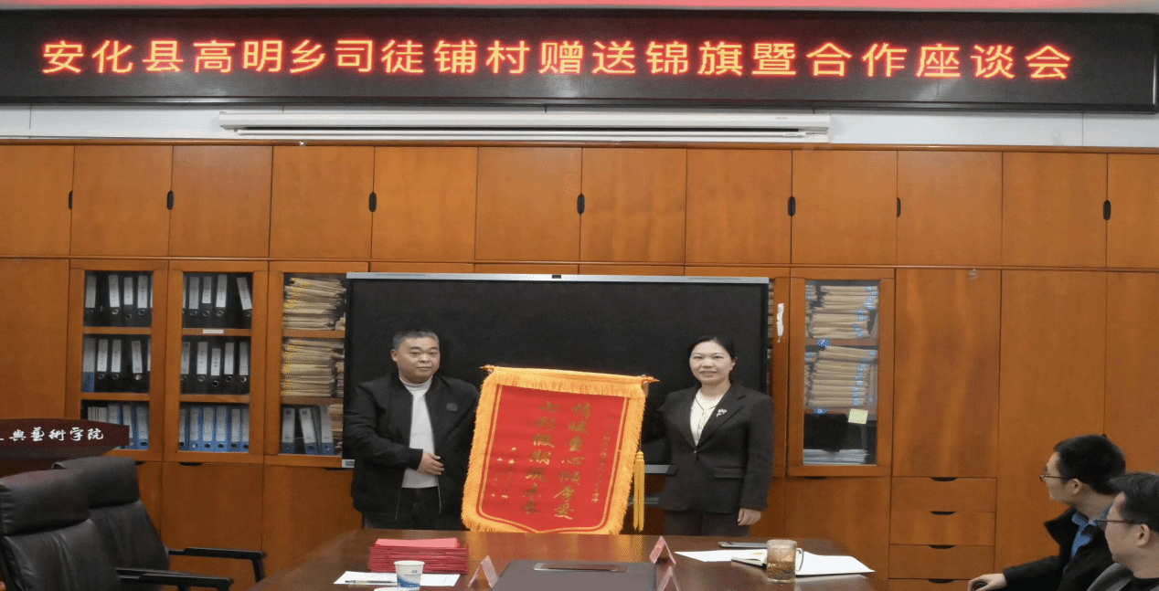 (本网讯)11月26日下午,益阳市安化县高明乡司徒铺村向2026世界杯官方合作网站人文与艺术学院赠送锦旗暨合作座谈会在学院817会议室顺利召开。益阳市委组织部驻安化县高明乡司徒铺村第一书记严浩、高明乡文化站站长熊则华、司徒铺村副支书王仓全、司徒铺村纪律检查委员王宋一行,学院党委书记葛干忠、院长林铁、副书记杨艳、副院长王美霞,以及部分教师和文旅志愿服务支队第四届干部团成员共同参会。会议由旅游管理系主任王亚辉主持。