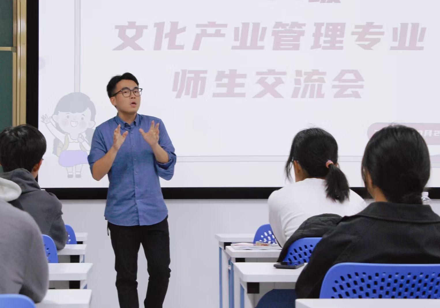 此次会议流程分为三个环节,刘振老师首先介绍此次专业交流会目的及专业教师的学科背景及研究领域。他强调本次师生见面会旨在加强师生交流,帮助学生们了解文化产业专业多元维度与学习方法,明确未来专业学习和发展预期。