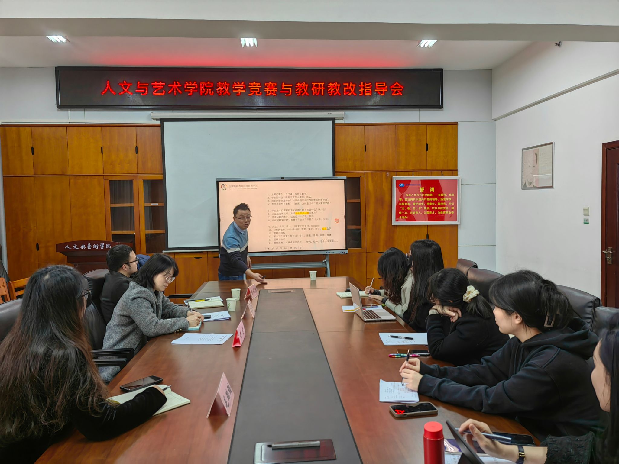 (本网讯)3月11日上午,人文与艺术学院在办公楼817会议室召开了教学竞赛与教研教改指导会议,邀请了教育部全国高校教师网络培训中心华南区负责人、资深高校教师培训专家黄定进行专业指导。会议由人文与艺术学院副院长毛璐璐主持,教务处副处长张晓鹏、教研科郭砚博及学院青年教师参加本次指导会。