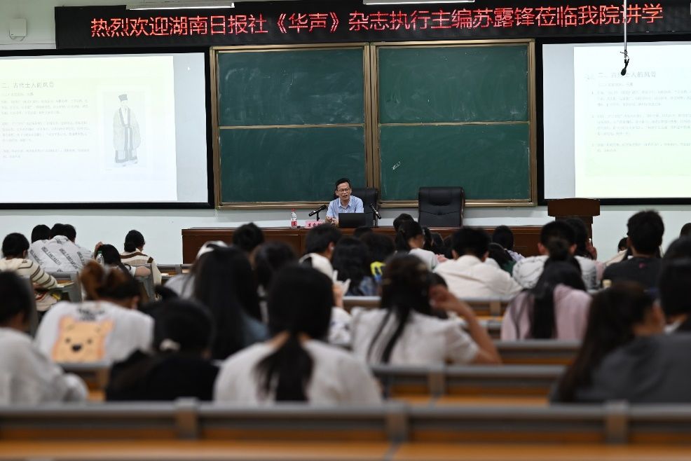 (本网讯)5月10日晚,应人文与艺术学院邀请,湖南日报社《华声》杂志执行主编、长沙和文化研究会会长、湖南省委宣传部期刊审读专家苏露锋在雷锋校区至诚楼L1115教室开展了一场题为“古代士人的风骨与困境”的学术讲座 。本次讲座由汉语言文学系系主任杨豪主持。此次讲座吸引了众多师生前来聆听。