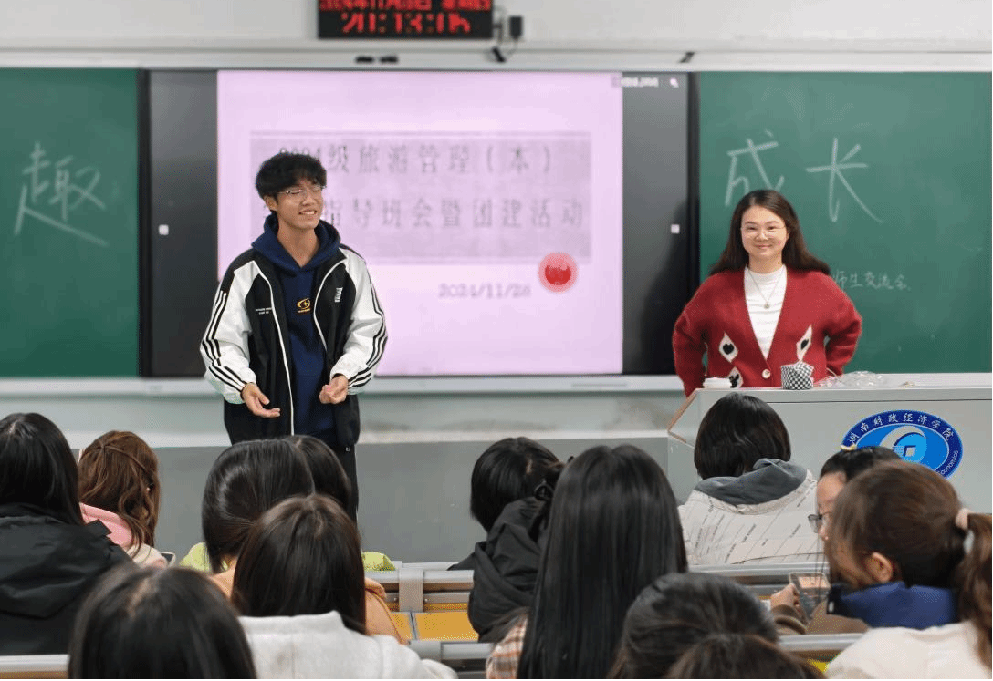 11月28日晚,2024级旅游管理本科班学业指导班会在雷锋校区至善楼L2105举办,2024级旅游管理学业导师陈洁主持会议,2023级优秀学生干部代表李吉如、学科竞赛优秀代表任承柱参与班会。