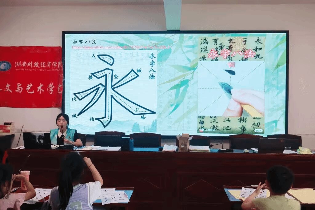 书法课上,志愿先锋队成员康馨月从认识毛笔结构和规范的五指执笔法(要点如手指实、掌心虚)入手,纠正错误姿势,讲解书法“八锋”运用(如中锋、侧锋)及楷书基础笔画与“永字八法”,并以颜真卿《多宝塔碑》为例分析笔画特点与笔法,最后引导孩子们欣赏“得闲饮茶”等作品,现场教孩子们提笔书写“安康”、“吉祥”等单字,让孩子们亲身感受到了书法艺术的魅力。