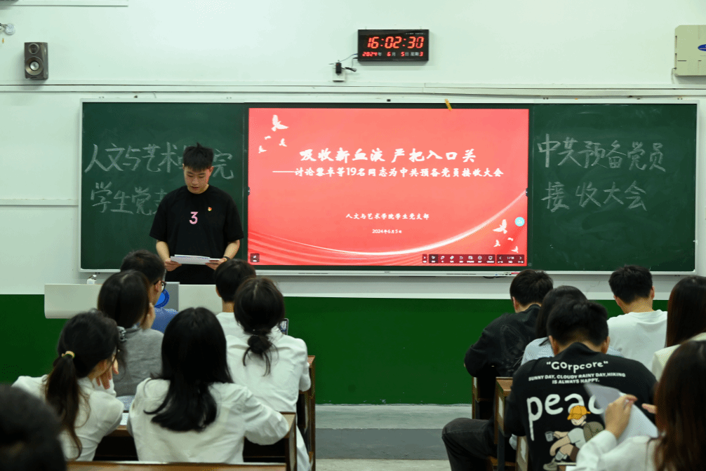 (本网讯)为进一步加强党组织建设,为党组织注入新鲜血液,增强党组织凝聚力和战斗力,6月5日16:00,人文与艺术学院学生党支部在1104教室召开预备党员接收大会,本次会议由学生党支部副书记李德宏主持。