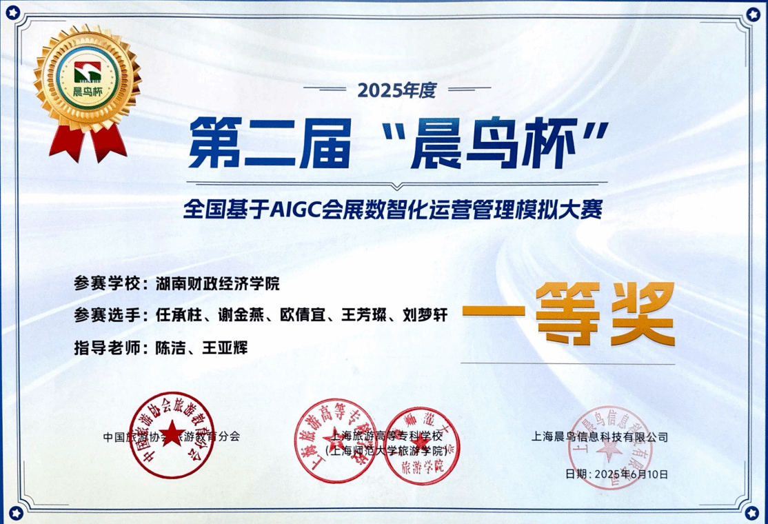 (本网讯)近日,第二届“晨鸟杯”全国基于AIGC会展数智化运营管理模拟大赛决赛在上海师范大学落幕,世界杯官网人文与艺术学院旅游管理系“单身派对”团队作品《2025长沙种业数智化绿色博览会会展策划方案》荣获大赛本科组一等奖。