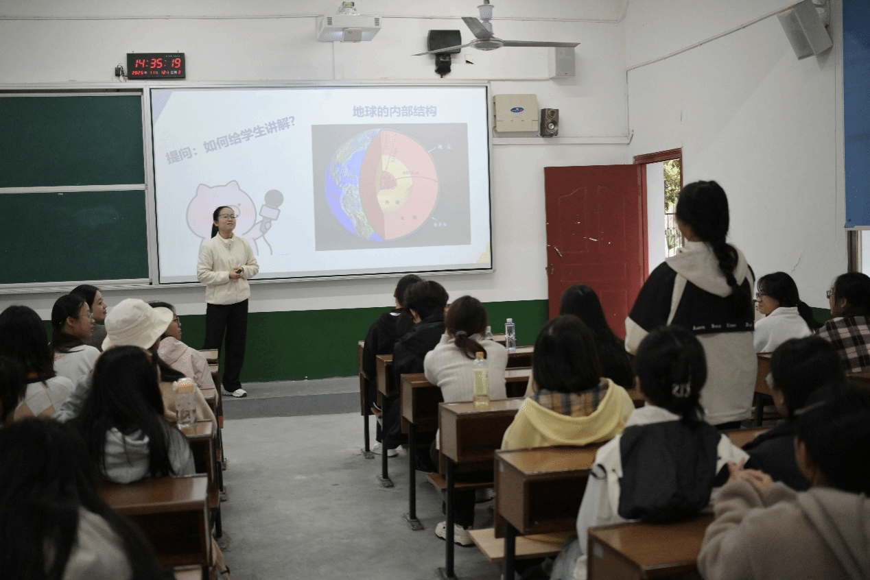 在简短的合影留念后,活动进入核心培训环节。姜澳带来了的科普讲解与研学带队技巧培训。在深度培训中,姜澳不仅讲解了科普讲解的语言艺术,更重点分享了在地质灾害研学实践中,如何有效组织、引导和管理学生的实用技巧与方法。她通过真实案例,生动演示了如何将专业的地质灾害知识转化为通俗易懂的科普内容,讲解过程将科学性、趣味性和实用性相统一。