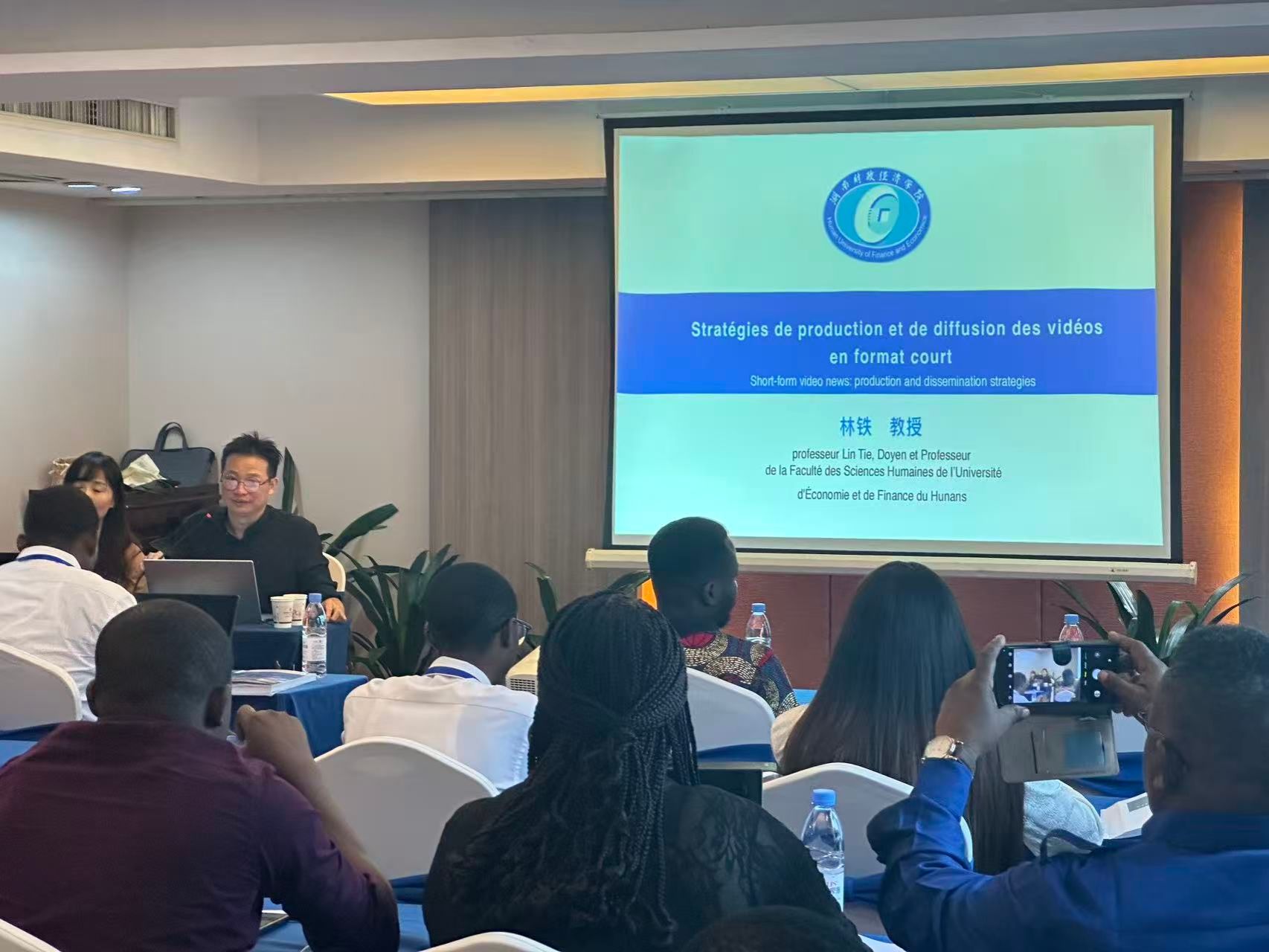 (本网讯)9月21日上午,人文与艺术学院院长林铁教授应邀为“刚果(金)新闻领域从业人员研修班”进行专题授课,讲座主题为《短视频新闻生产与传播策略》。本次研修班由商务部主办、湖南省商务厅承办。