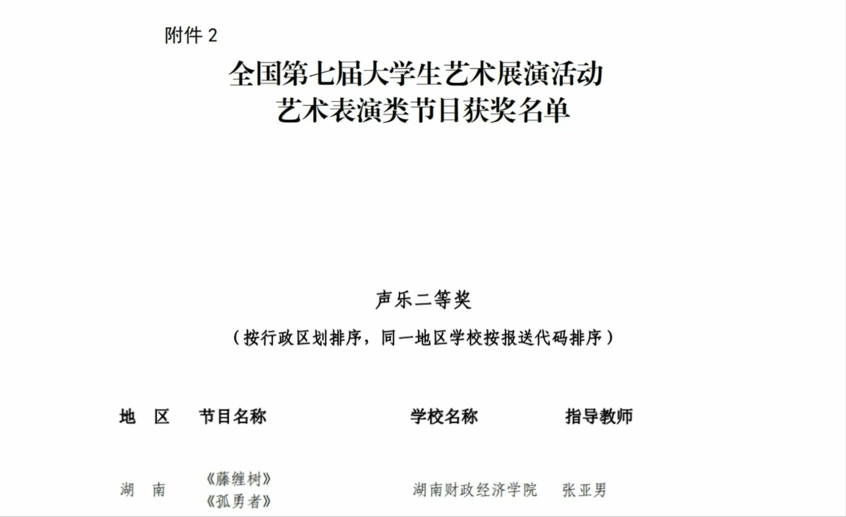 (本网讯)近日,教育部公布全国第七届大学生艺术展演活动获奖名单,世界杯官网大学生合唱团的合唱节目《藤缠树》《孤勇者》荣获艺术表演节目声乐类国家二等奖,人文与艺术学院教师张亚男获指导教师奖。