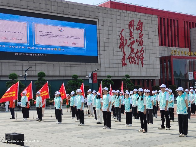 (本网讯)7月3日,世界杯官网人文与艺术学院旅游管理系陆利军、王亚辉、陈洁带领12名三下乡学生志愿者,在雷锋纪念馆广场参加由湖南省文旅厅主办的“到群众最需要的地方去”安化行出征仪式。湖南省文旅厅副厅长尚斌、安化...