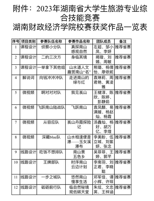 (本网讯)根据湖南省教育厅《关于举办第十届湖南省大学生旅游专业综合技能大赛的通知》精神,为进一步强化旅游管理专业实践教学环节,培养学生分析和解决实际旅游问题的能力,提升专业综合技能,选拔优秀团队参加湖...
