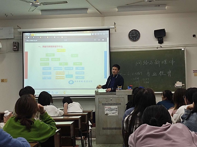 (本网讯)10月27日晚,2020级网络与新媒体一班入学专业教育在二教2410教室举行,本次讲座由学业导师李成家老师主讲。李成家老师在给大家做讲座李成家老师首先介绍了我院网络与新媒体专业办学的基本情况,并结合“网...