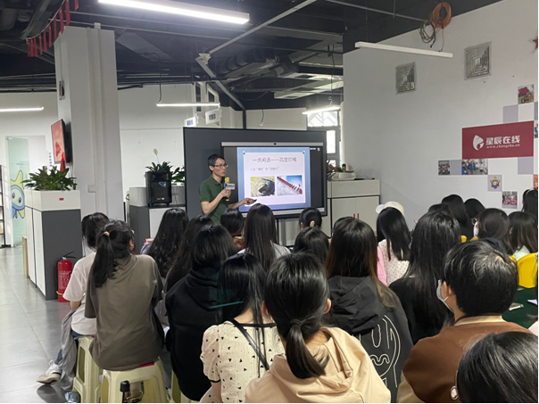(本网讯)5月26日下午,2021级网络与新媒体1班学生在学业指导老师刘佳的带领下,前往天合智造及湖南广播电视台开展专业认知活动。天合智造负责人进行后期制作流程分享 在天合智造,工作人员先后带领同...