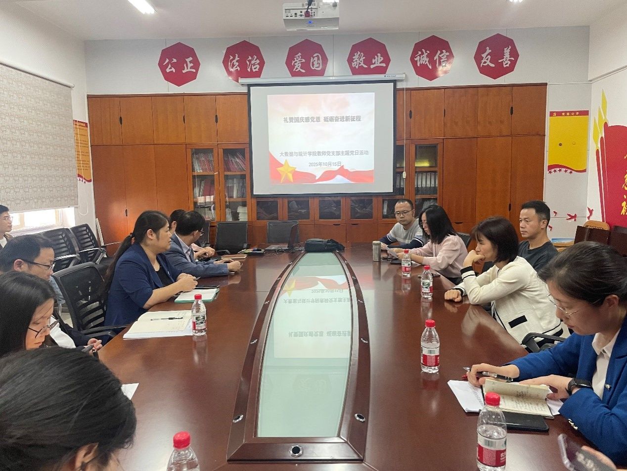 2025年10月15日下午,大数据与统计学院教师党支部于办公楼809会议室开展“礼赞国庆感党恩,砥砺奋进新征程”主题党日活动。本次活动由支部书记丁德琼主持,全体教师党员参加。