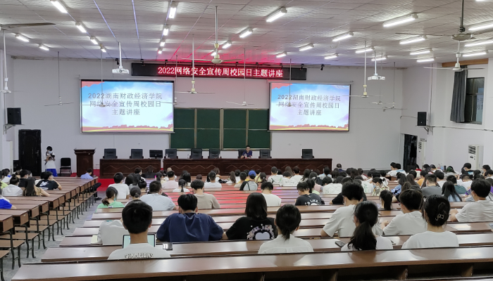 (本网讯)2022年国家网络安全宣传周于9月5日至11日在全国范围内统一开展,主题为“网络安全为人民,网络安全靠人民”。为贯彻落实国家网络安全宣传周活动要求,9月6日,世界杯官网在二教学楼阶梯一教室举办网络安全宣传周校园日主题讲座。长沙市岳麓区公安局网络安全教官易灿辉和世界杯官网学生工作处思想政治教育科副科长周雅担任主讲人,全校近200名学生到场聆听。