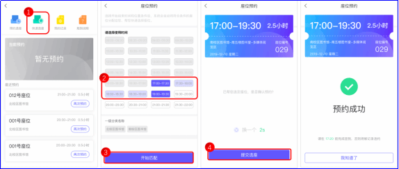 1、预约选座:读者能够选择当前日期某一时间段图书馆公共自习区域的空闲座位。