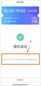 预约完成后显示当前预约信息,包括座位所属位置、座位编号、预约日期、预约起始时段、预约总时长。
