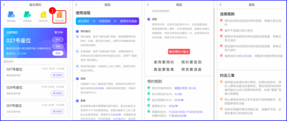 支持读者查看图书馆座位预约系统的预约说明,包括详细的使用流程指引,以及预约规则、违约规则等。【图片为示意图】