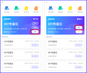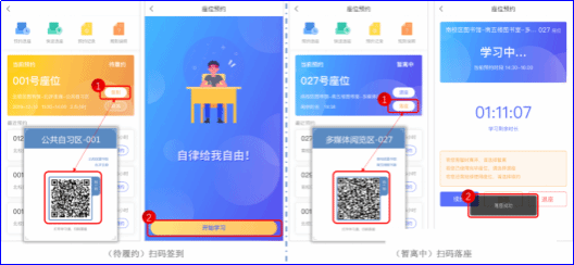 读者不再使用座位时,应将座位释放。读者可进入个人应用首页在当前预约卡片点击“退座”或扫描座位上的二维码点击“退座”释放座位。读者退座完成后系统自动记录读者履约一次;逾期未退座的,将被记录为违约行为。【图片为示意图】