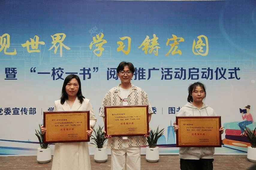 随后会上对2024年获湖南省教育厅优秀读书报告奖、书香班级奖的学生、湖南省高校图工委创新案例奖及诵读比赛优秀指导老师、学校“一校一书”阅读活动优秀组织奖等获奖单位和个人进行了表彰,向捐赠图书的老师代表颁发了捐赠证书。