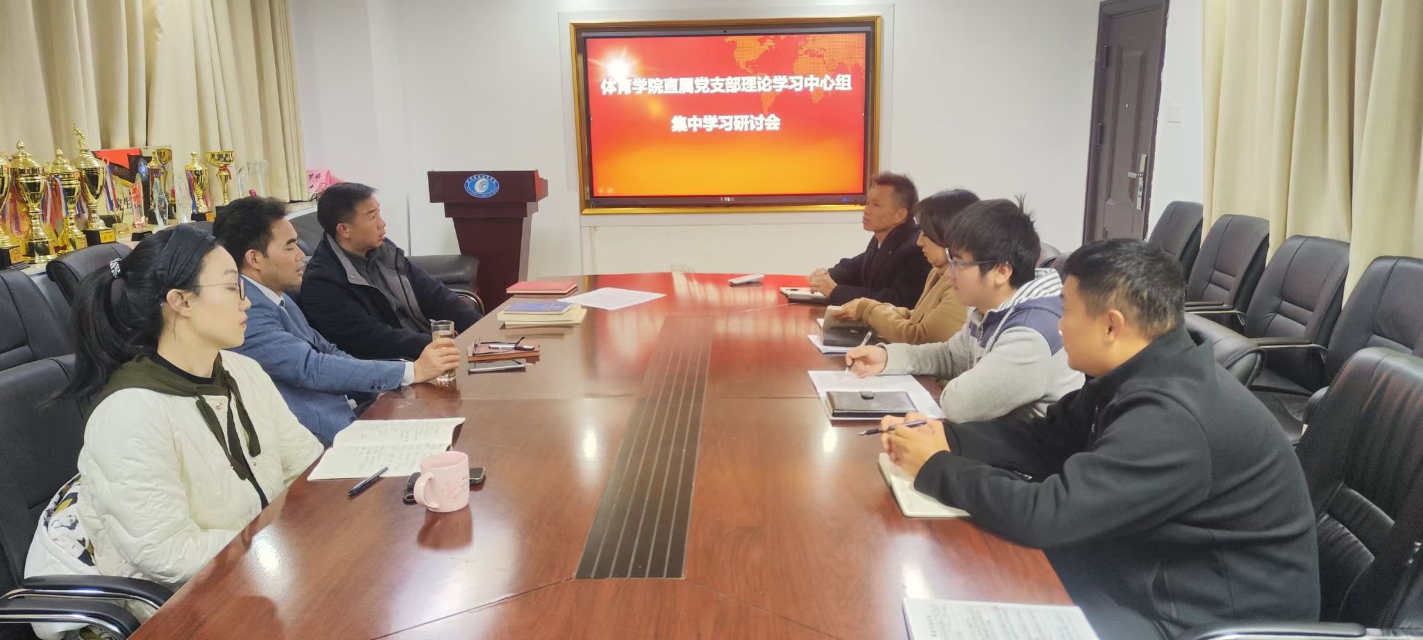 2025年12月5日,体育学院直属党支部理论学习中心组学习(扩大)会议在体育学院237会议室召开,会议由范则周主持,刘伟、范则周、宫梦婷、汪洋、黄涛、张旸、文杰、徐俊等人员参加。此次会议聚焦专题研究意识形态工作与统一战线相关工作。