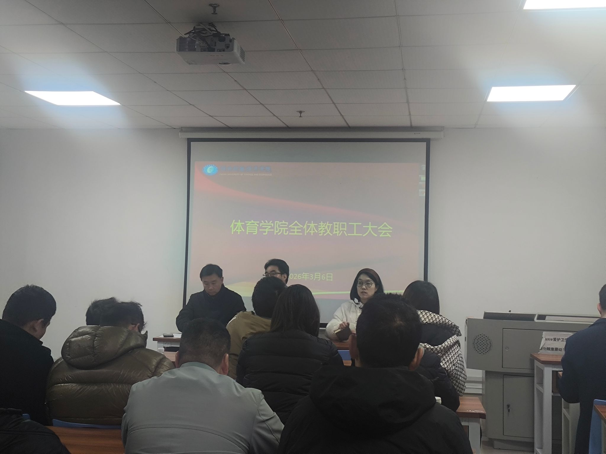 (本网讯)3月6日,体育学院在体育馆238会议室召开新学期全体教职工大会,此次会议紧承学校整体工作部署,围绕思想引领、教学管理、学生发展及学院战略规划等核心议题展开深入部署,旨在将学校领导在全体教职工大会上的指示精神融入学院具体工作,推动学院在新学期实现高质量发展。会议由院长刘伟主持,全体教职工参会,共同为新学期工作凝聚共识、明确方向。