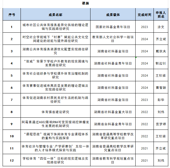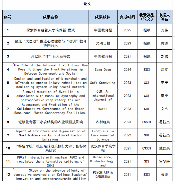 2.国家级、省级成果亮点纷呈,科研领域深入探讨社区体育发展大计,为健康中国战略在基层落地提供智慧方案。在论文发表方面,学院教师在国内外期刊上绽放光彩。从国内核心期刊到国际知名刊物,一篇篇高质量论文如智慧的火种,传播体育学术思想,提升学院学术影响力。