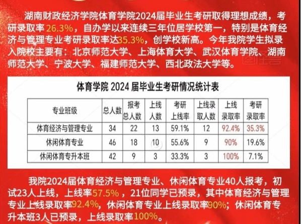 3.学生竞争力提升,近三届毕业生就业率连续达100%,考研录取率20%以上(北体、上体、武体等),居全省同类院校前列。获省级以上体育竞赛奖项百余项,如全国大学生体育产业创新创业总决赛铜奖。