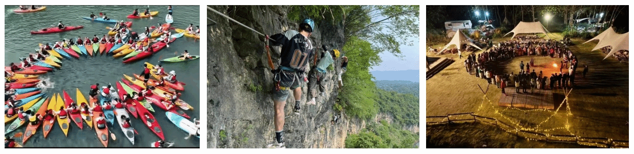2. 多元化技能实训,联合行业协会开设户外指导员、营地规划师等职业资格培训。每年11月组织体育学院休闲体育、体育经济与管理专业两百余名师生前往鹅洲岛户外营地实践基地开展常态化专业认知实践,活动内容包括户外徒步、趣味飞盘、腰旗橄榄球、气排球、自助烧烤、篝火晚、攀岩、扁带运动、营地运营等实训,强化户外产业认知。