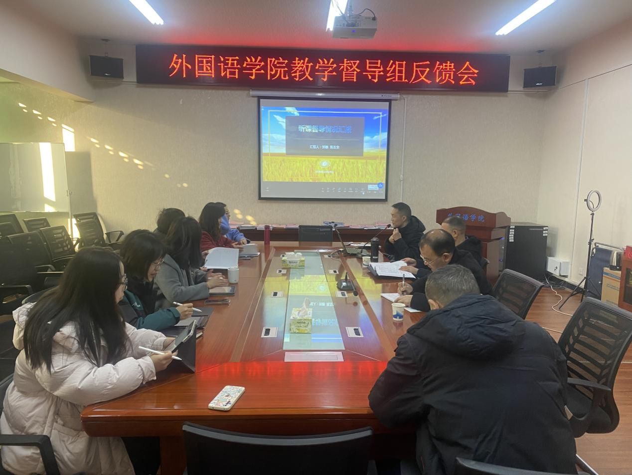 (本网讯)为切实提升教学水平,反馈教学信息,提升课堂教学质量,促进课堂教学改革,12月25日上午,外国语学院在办公楼315召开教学督导组反馈会。校督导组郭鹏、陈友余,质评处副主任王依、学院副院长李曦、教科办科主任殷琛及各系部主任参加会议,会议由李曦主持。