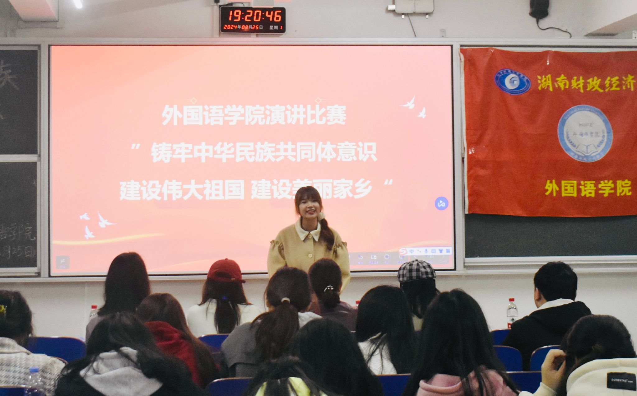 (本网讯)为全面贯彻党的二十大精神,深入开展习近平新时代中国特色社会主义思想主题教育,外国语学院于3月25日晚上7点在3109教室开展以“铸牢中华民族共同体意识,建设伟大祖国,建设美丽家乡”为主题的演讲比赛。外国语学院党委副书记张鹏出席活动。