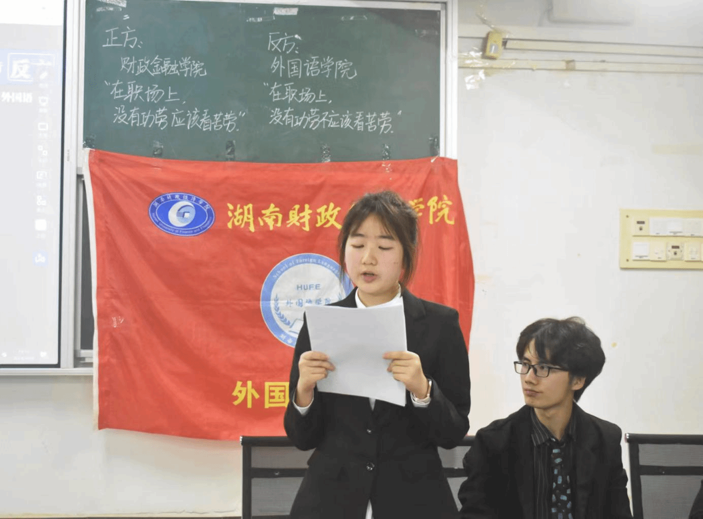 (本网讯)根据学校第十三届学术节的安排,外国语学院与财政金融学院于4月24日19:00在3110教室联合举办了“金融创新,学而优术”第十三届大学生学术节辩论赛初赛。财政金融学院与外国语学院分别作为正反双方,以“在职场,没有功劳,是否应该有苦劳”为议题展开了激烈的辩论。