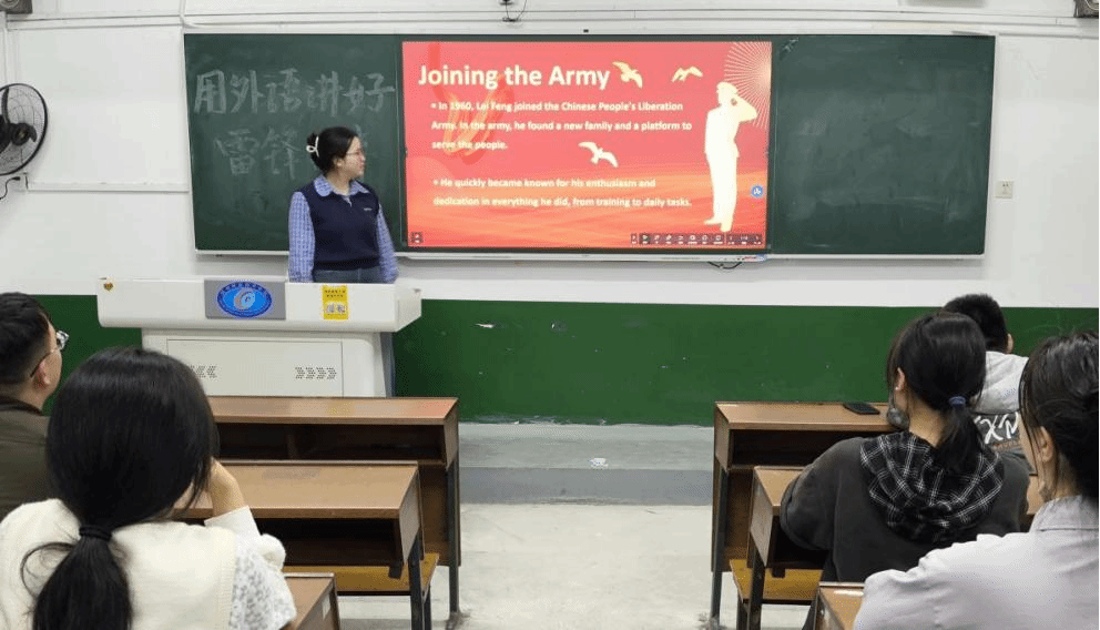 活动现场氛围热烈非凡,演讲者们凭借流利的外语技巧,深情讲述了雷锋同志用自己微薄的积蓄捐款助人、义务为乘客指引道路等感人至深的故事。他们不仅生动再现了雷锋的感人事迹,更将雷锋精神与现实生活紧密结合,深入探讨了在当代社会中传承与践行雷锋精神的具体路径,积极倡导同学们在日常生活中多行善举,踊跃参与志愿服务活动。